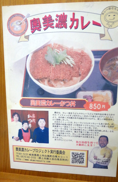地元のB級グルメは「奥美濃カレー」なので、それを食べられるお店の一つの大和屋にきた。店内は地元らしき家族連れが二組。なかなか私の来店を気づいてもらえない。メニューは豊富。一番右に書いてある食事の「名代 かつ丼」が一押しなのだろう。しかし、今日は奥美濃カレー。お店の方に聞くと、この店では「奥美濃カレーかつ丼(850円)」だけだということだ。それを注文して、待つこと30分強。やっと出てきた奥美濃カレーかつ丼。カレーの香りが心地よい。かつ丼にカレールーが染みており、ごはんにもルーがこぼれている。これはこれで立派なB級グルメである。山形県西村山郡河北町のといやは「カレー風味のかつ丼」だったが、こちらの方がインパクトは高い。(2016/9)
