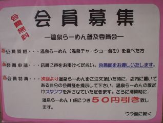 スープは醤油色の甘め。ダシは豚骨と野菜かな。背脂も少しあるので余計に甘く感じるのかもしれない。麺は中やや縮れ麺。具は、チャーシュー(1)・メンマ・わかめ・ネギ・背脂。チャーシューは厚みがあり柔らかくて美味。ネギにもこだわりがあり、「大山ねぎ」とか書いてある。うーん、伊勢原の大山のネギって有名だっけ? と思ってよく見たら「鳥取県の大山(だいせん)」だった。温泉らーめんは温泉タマゴが入っていた。