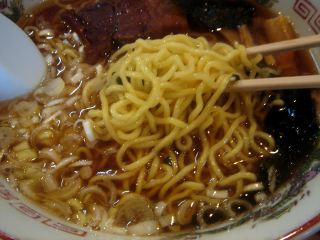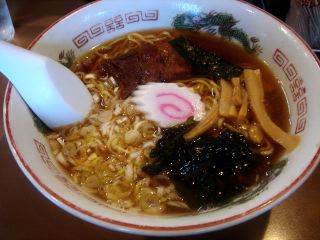 たちまち出てきたラーメンは、スープは鶏ガラベースのあっさりとした醤油味。中華料理店のラーメンのようだ。麺は中縮れ麺。具は、チャーシュー・メンマ・のり・なると・ワカメ・ネギ。チャーシューは味つきで厚くて美味しい。(2006.9.18)