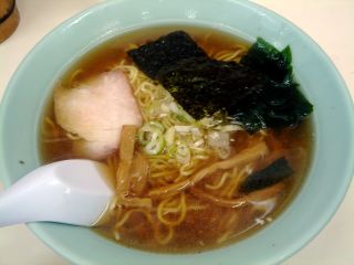 大衆的な中華・定食屋さん。広い駐車場から常連客らしきお客さんが次々と店に入り、店内はかなり込んでいる。メニューはラーメン500、みそラーメン550、Aセット(ラーメン+半チャーハン)950、Bセット(ラーメン+半中華丼)1000、定食や中華メニューが多い。カウンターに座りラーメンを注文。二人の男性が調理担当のようで、一人が麺類、もう一人が定食と手分けしているようだ。