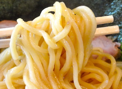 待ち時間がかなり長く感じましたが、やっと出てきました。意外とあっさりとした豚骨スープなんですね。学生のお客さんが多いのでもっとこってりしているかと予想していました。スープはぬるく感じました。私はもっと熱々が好みです。(2013/06)