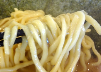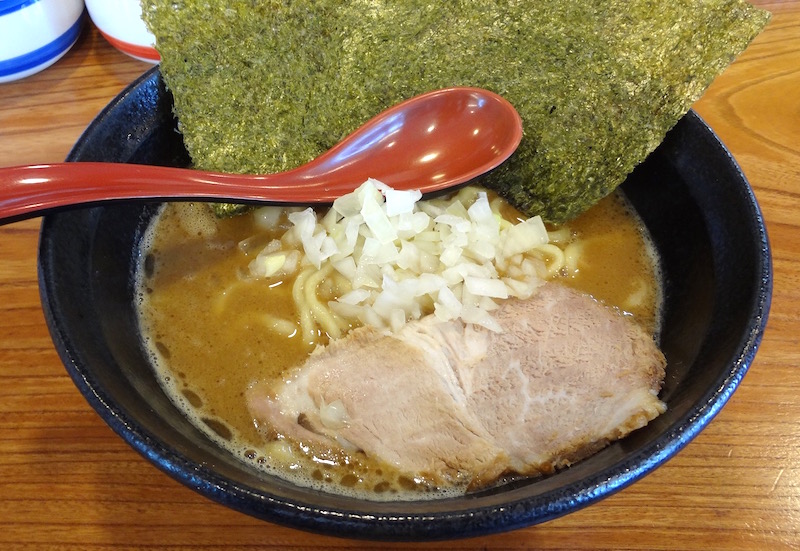 出てきたラーメンは、炊き出し豚骨だけあってスープのとろみは強い。その強いスープに負けないような中太麺。具は、タマネギみじん切り、チャーシュー、のり(3)で、ほうれん草は別料金でトッピング可能。家系のようで家系ではない。食べ終わってから喉が渇いた。(2018/4)