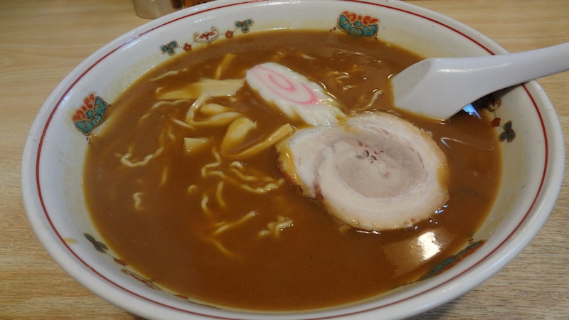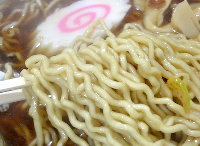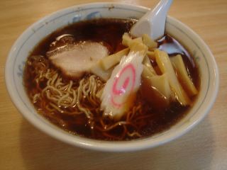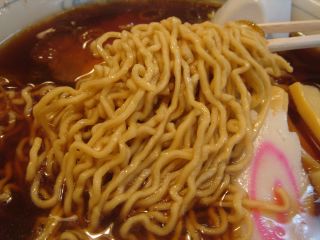 ほどなく出てきたラーメンは、スープは黒い醤油色で、そばのダシのような和風仕立て。麺は、個性的な中細ゴワゴワ縮れ麺。本当にゴワゴワしており、“すする”というより“ワシワシと食べる”という感じだ。具は、チャーシュー・メンマ・ナルト・ネギ。チャーシューとメンマも美味。これらをつまみに一杯やりたいくらいだ。(2006.07.01)