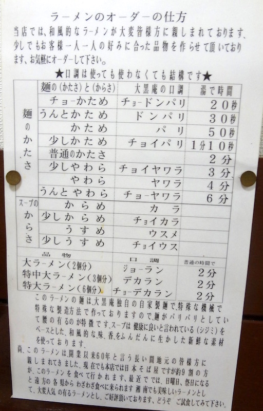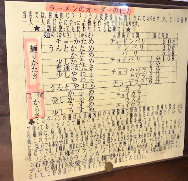 このお店に来るのは今回で9回目。すべてラーメンを注文している。数日前の「もやもや さまーず2」でさまーずが立ち寄ったので、妻を誘って行った。時刻は14時だったが、ほぼ満席。店外で一人二人が待っているような状態。さすがの大黒庵なのか、テレビの影響なのか、おそらくその両方だろう。