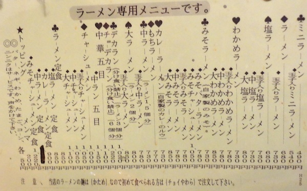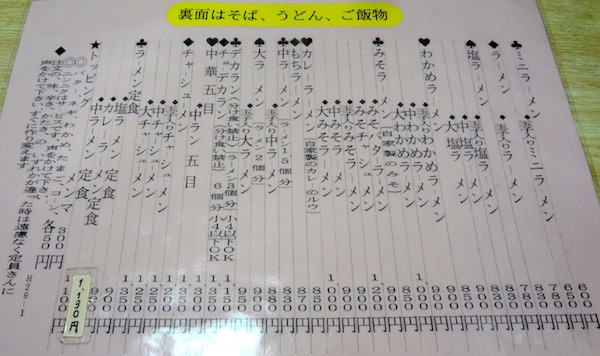 [コメント]相変わらずのラーメン人気でお客の8割方はラーメンを注文している。麺の硬さは7段階、スープの濃さは5段階から選ぶことができ、その他いろいろな注文に応じてくれるようだ。メニューは、ラーメン580、大ラーメン680、チャーシューメン850、中華五目950の他、多数。スープは、和風であるが油が多く、熱々でなかなか冷めない。麺は、前回よりもゴワゴワした感じは少なかったが、それでも非常に特徴的な麺ではある。具は、チャーシュー(1)・なると・メンマ・ネギ。