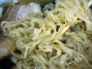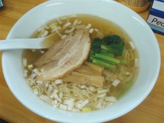 しばらくして出てきたラーメンは、スープは澄んでいて上品である。飲んでみてもあっさりしていて美味しい。麺はピロピロとした平打ち麺で柔らかい。竹での手打ち麺であろうか? 具は、チャーシュー・メンマ・小松菜・ネギ。(2008/12/12)