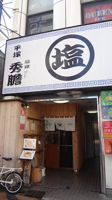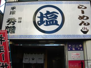 家族で東京へ行った帰りに、たまには東海道で平塚まで帰ってきた。小腹が空いたので、平塚駅西口界隈のわい雑とした繁華街をキョロキョロすると、緑の提灯が目に入った。そこが秀膽(ひでたん)である。私は塩つけ麺、妻は水餃子、長男は塩チャーシュー麺、次男は塩支那そばである。