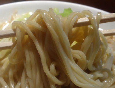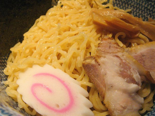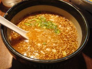 一番早くでてきたのがつけ麺。麺は中細の縮れ麺で、つけ汁がよく絡む。つけ汁は、カツオとゴマの風味が強調された柔らかい口当たりの優しい味である。(2010/08)