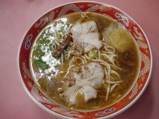 テレビを見ているとラーメンが到着。豚骨であるが白濁ではなく、見た目は茶色い熱々のスープ。豚骨のダシがよく出ている。麺は、中ストレートで美味しい味がする。具は、チャーシュー(薄3)・メンマ・もやし・ネギ。メンマは色が濃くしっかりと味付されている。広島ラーメンでもこちらは赤い縁取りの丼を使う店が多いので“赤縁系”と呼ばれている。一方、茶濁した豚骨スープのラーメンは「つばめ」「すずめ」「うぐいす」などと小鳥の名前が店名になっていることが多く“小鳥系”と呼ばれている。(2004/11/13)