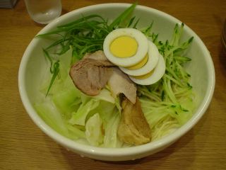 まずつけダレが出てきた。箸を使って少し舐めてみる。辛いが何とか食べられそうであるし、辛いだけでなく甘味も感じることができる。麺が出てきた。大量のキャベツ・キュウリ・ネギ(V字切り)で麺が見えない。チャーシューの細切りや茹で卵も添えてある。麺は縮れのコシがあるもの。辛いつけダレに負けるわけにはいかない。野菜を大量に摂取することができ、なかなか健康的な感じがする。(2005.09.18)