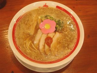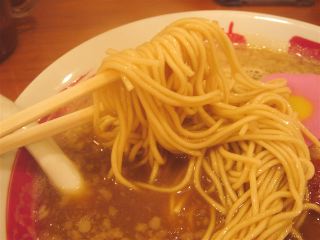 たちまち出てきたラーメンは、背脂の目立つ濃厚そうなもの。スープは豚骨ダシであるがやや薄めか。それを補うように背脂が一面に浮いている。麺は中細ストレート。具は、チャーシュー(薄×4)・メンマ・カマボコ・ネギ。ドンブリの底には「完食感謝」の文字がある。新・和歌山の「新」の意味はわからなかったが、濃厚なこってりとしたラーメンだった。(2009/10/10)