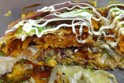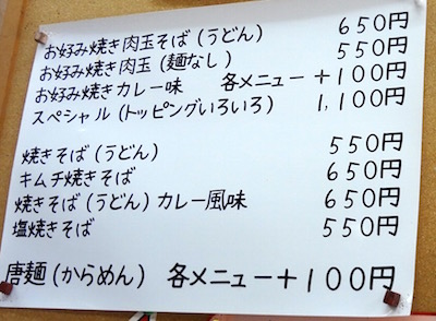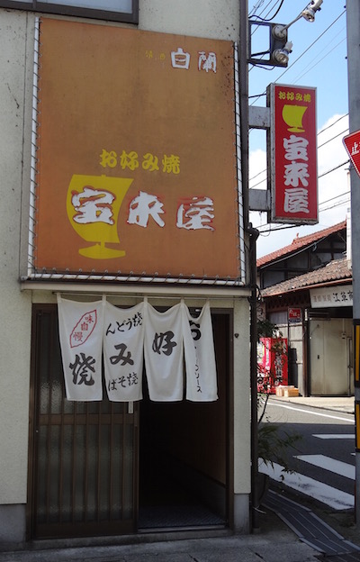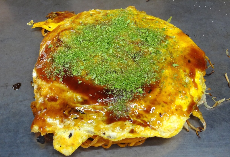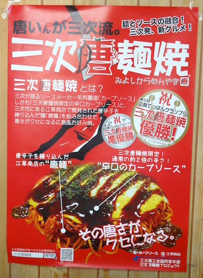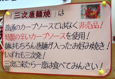 三次のB級グルメの「唐麺焼」を食べに廣島葱坊主に行くが臨時休業。仕方がないので、宝来屋にやってきた。唐辛子を練り込んだ麺(そば)を入れた広島風お好み焼きである。麺をしっかりと焼くためか、お好み焼きの中に入っている麺はパリパリしている。そしてもちろん唐辛子のために辛い。おたふくソースが甘いのでこれはこれでいいのだが、なんと辛いおたふくソースもある。私は甘いソースしかかけなかった。麺を変えるだけでお好み焼きが個性的になった。(2017/10)
