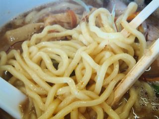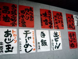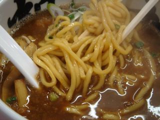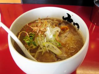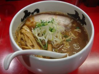 小振りな丼に入ったラーメンが出てきた。強い魚介系のスープをこれまた強い豚骨で支えたスープはとろみもありかなり強い。店内のにおいに比べるとラーメン自体はしっとりと落ち着いているのが不思議である。麺も超極太でスープに負けていない。この麺で、つけ麺も食べたいくらいだ。具は、チャーシュー・メンマ・ネギ。店主と店員の対応はキビキビしていて清々しく感じる。ただし店内の魚臭いにおいには好みがあるだろう。(2007.3.17)