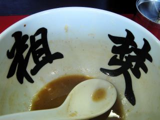 丁寧な仕事ぶりが見えるオープンキッチンで作られるラーメンは、作っている時からワクワクする楽しみがある。やがて出てきたラーメンは、濃厚で魚介系のエキスがたっぷりと入ったスープに、太縮れ麺でプリプリした極上の麺がピッタリと合う。具は、炙りチャーシュー・メンマ・糸とうがらし・ネギなど。一部わからない具材もある。完食! 丼には「粗焚」の文字があった。(2007/10/7)