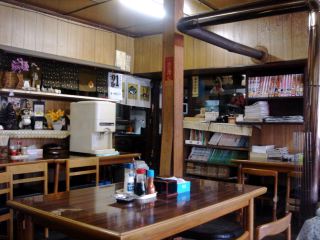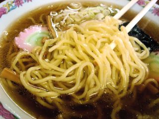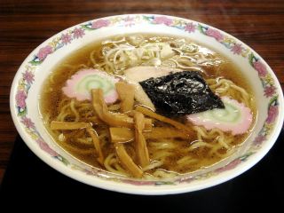 区画整理から取り残されたような三角地帯にあり、店外・店内ともに昭和30〜40年代の映画のセットのような空間である。創業60年を超えるとのことである。常連客の出入りが激しい。本質的にはそば屋のようでそばやうどんのメニューが多い。お冷がすぐ出てきたので、メニューをゆっくり眺めている時間がない。そこで「中華そばはありますか?」と若い女性に尋ねると「ラーメンですね」とあっさり言われた。メニューを眺め直してみると確かにラーメン430円と言うのがある。以前は400円だったようだが最近値上がりしたようだ。お客さんの半数くらいがラーメンを注文している。スープは鶏ガラ中心の醤油味で、麺は中やや縮れで小麦の香りを失っていない。具は、チャーシュー(モモ)・メンマ・のり・ナルト(2種)・ネギ。(2007.6.21)