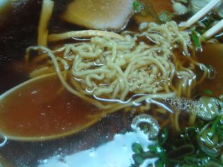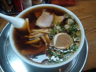 スープは大きな丼になみなみと注がれており溢れそう。しかも熱々である。おそらく昆布・カツオなどの魚介系が中心ではないか。和風である。麺は中細の縮れ麺。喉ごしがよいが食べているうちに中太麺になってくる。具は、チャーシュー・メンマ・お麩・ネギ。(2006.10.17)