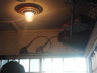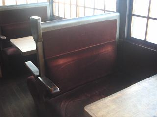 列車の座席がそのままイス ◇ 壁にはタブレットと網棚