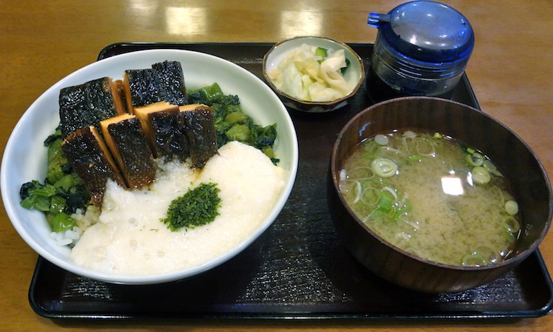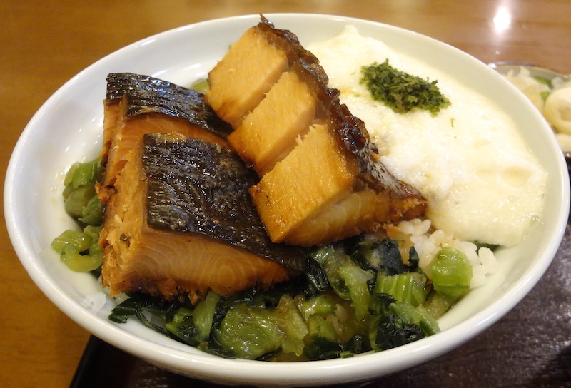 マス漬けトロ丼を注文した。しばらくたって出てきたものは見るからに美味しそうなもの。マス漬けとトロロとお新香でそれぞれ丼飯が一杯食べられそうだが、これで一杯とは贅沢な丼である。(2012/10)