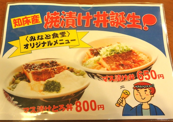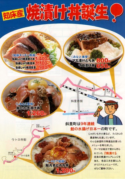 蕎麦屋ではあるが、地元の大衆料理点でもある感じのお店。伺った時には2階で宴会らしきものが行われていた。斜里町は鮭の水揚げ日本一を誇るので、町をあげてご当地グルメとして「知床しゃり焼漬け」を開発した。“焼漬け”とは、焼くかたたきにした地元のシャケかマスを、黒醤油やみりんなどのタレで甘めにしっかりと漬け込んだもののことである。