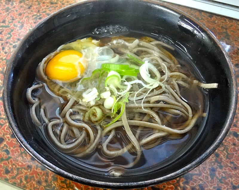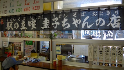 駅そばのお店に個人の名前がついているのは珍しいですね。このお店は圭子ちゃんのお店という名前ですが、富良野駅にある駅そばなのです。そば・うどんのメニューは、かけ330、月見360、わかめ360、天ぷら380、山菜380、きつね380で、他におにぎり(うめ・かつお)120。たぬきはないようですね。月見そばを注文しました。すぐに出てくるところが駅そばのいいところ。やや甘めのつゆに幅広い黒いそばが合いますね。寒いのでスープを飲んで温かくなりましょう。(2012/10)