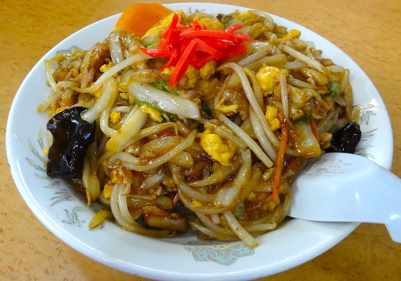 帯広のB級グルメとしては中華ちらしが注目されているようです。帯広駅から徒歩で南下すること約15分。大通公園のそばに味福がありました。味福と書いて「あじゃふく」と読むようです。お店の看板には寿司正中華部と書いてあります。道路の反対側の寿司屋が寿司正のようです。メニューは、正油ラーメン470、塩ラーメン470、特製みそラーメン580、海そうラーメン1,100、カニラーメン840、中華チラシ630、中華飯630、天津飯630、五目炒飯580、カニ炒飯680、ふた丼730、カツ重740、親子重630など。注文するのはもちろん中華ちらしです。お客さんは地元の常連さんらしき人が大半ですが、半分以上は中華ちらしを食べています。