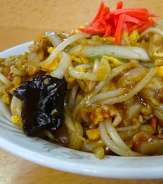 出てきた中華ちらしはとろみを押さえた肉・タマゴ・野菜炒め丼といったところでしょうか。レンゲが付いてきます。せっかくですからレンゲで食べてみましょう。それにしてもボリュームがすごいです。横から撮影するとその高さがわかります。甘辛い味付けがいいですね。濃すぎず薄すぎず、絶妙の味つけです。これは人気でるのがわかります。B級グルメの祭典、B-1グランプリにもいずれ出そうな予感がします。(2012/10)