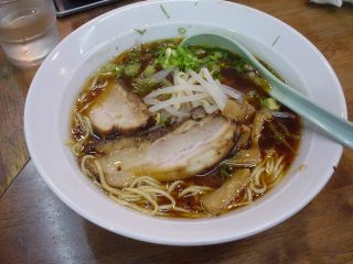 出てきたラーメンは醤油色のスープが目立つもの。スープは、京都の新福菜館を思い出すような味。清湯系の豚骨醤油スープ。麺は中細ストレート麺。これも新福菜館風である(と思う)。具は、チャーシュー・メンマ・もやし・ネギ。チャーシューは美味。(2005.5.12)