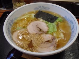 スープは塩に近い醤油味、つまり上品で柔らかい醤油味に仕上がっている。もちろん魚介系のダシが和風感を強める。麺は、細ストレート。ツルツルしており喉ごしがよい。具は、チャーシュー(巻きバラ×3)・キャベツ・のり・ゴマ。(2005.5.13)