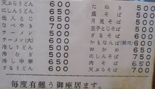 [コメント]朝の9時30分から営業しているそば屋の中華そばです。町の旧道沿い(多分)にあり老舗といった感じです。ディスプレイには“中華そば”とありましたが、テーブルのメニューには“ラーメン”となっていました。まぁ、どっちでもいいのですが・・・その中華そばのスープはそば屋のものとしてはしっかりとダシがとってある感じがしました。でもやや塩辛さが舌に残ります。麺は中ストレートでコシがありなかなかの食感です。具は、チャーシュー・もやし・ネギといたってシンプルです。