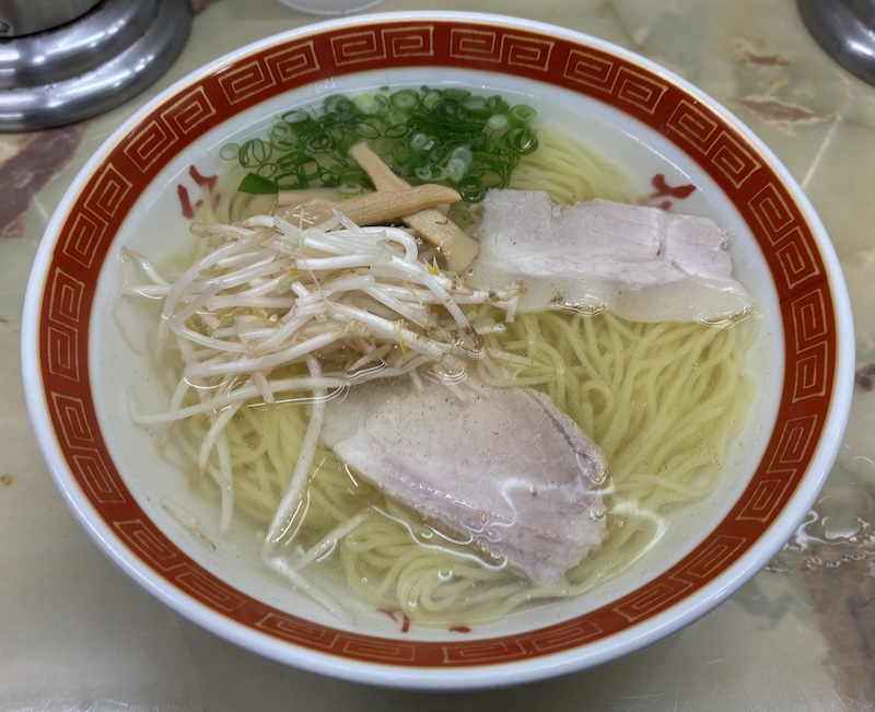 1960年(昭和35年)創業の老舗。「塩ラーメンが美味しいと聞いて来た」というと「ラーメンとワンタンメンしかない」との返事。ラーメンを注文。出てきたラーメンはまさしく塩ラーメンだ。あっさりしすぎている感じもあるが悪くない。(2025/6)