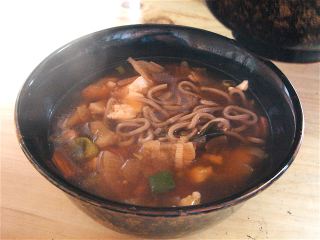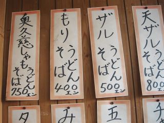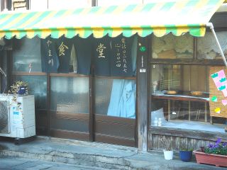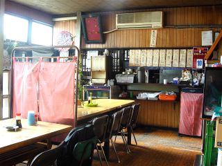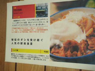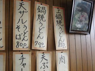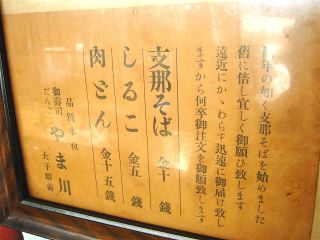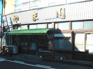 中へ入るとご主人が出前のけんちんそばを作っているところだったが、店内にはお客さんは誰もおらず貸切り状態になった。「ようこそいらっしゃいました。寒いから今ストーブ点けますね」といいストーブに火を点けながら「これよかったら食べていてください」とけんちんそばを一人前テーブルに置いた。いきなりの大サービスである。いやー驚きである。またこのそばが美味しい! ダシが利いていて冷たくなった身体を内側から暖めてくれる。ご主人が近くまで出前に行って来てから、我々の注文を聞いてくれた。そばを食べたのでご飯ものが欲しくなり、奥久慈しゃも丼(800円)を2つ注文する。しゃもの肉も身がしまっておりとても素晴らしい味である。ご飯の量もたっぷり入っており寒さと空腹がともに一挙に克服できた。そして、ご主人としばしのお茶の間モードに入るのに何も障害はなかった。店内に貼ってあった魚拓から釣りの話しになり、パチンコの話し、映画撮影の話し、そして相模大塚にいる娘さんの話し、四代目となるやま川食堂の話しなど多くを語り、ほのぼのとした時間を過した(釣りとパチンコはもっぱら叔父の担当(笑))。店内には昔のお品書き「支那そば十銭、しるこ五銭、肉丼十五銭」が日焼けをしながらも飾られていた。すごい駅前食堂の体験ができた。いままでも食堂でお茶の間モードに入ってサービスを受けたことがあるが、注文前にそれもけんちんそば1人前が出て来るとは奇跡的でさえある。人情深いやま川食堂のご主人に、ただただ感謝するばかりである。(2009/01)