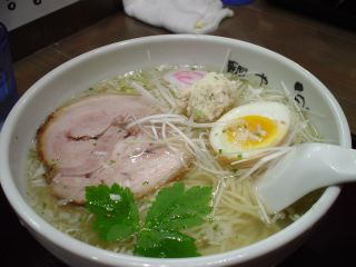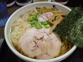 スープは透明で煮干しの風味が効いた塩味。あっさりしている。麺は、平縮れ麺。スープの絡みがよく、コシもあり、喉ごしもよい。具は、チャーシュー(超柔らか)・なると・ゆで玉子(1/2)・白髪ネギ。