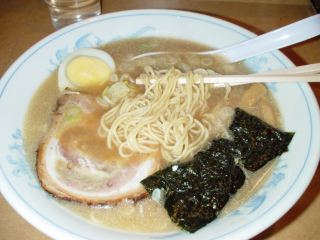 スープは茶濁した豚骨醤油味。記憶によるともっと背脂が多かったようだが、油少なめにしたからかどうかわからないが、それほどでもない。でもかなりこってりとしている。麺は、写真のように中細やや縮れ麺で、硬めにしたからかどうかわからないが、なかなかの食感。具は、チャーシュー(とろける)・メンマ・のり・茹で卵(1/2)・ネギ。途中でおろしニンニクを投入したら少しすっきりとした味わいになった。食べている途中、取引先の人と店で遭遇。同じような行動だなぁ、とお互いにニヤリ。