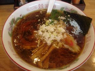 でてきたラーメンは、スープはかなり濃い醤油色。飲んでみると豚骨・鶏ガラベースに昆布などが効いていて、かなり濃厚な醤油味。麺は中細縮れ麺で歯ごたえも十分でかなり美味しい。具はチャーシュー・メンマ・のり・なると・ほうれん草・ネギ。チャーシューは肉厚で味がついており柔らかい一品。東京ラーメンと豚骨醤油ラーメンも食べてみたい。(2006.9.17)