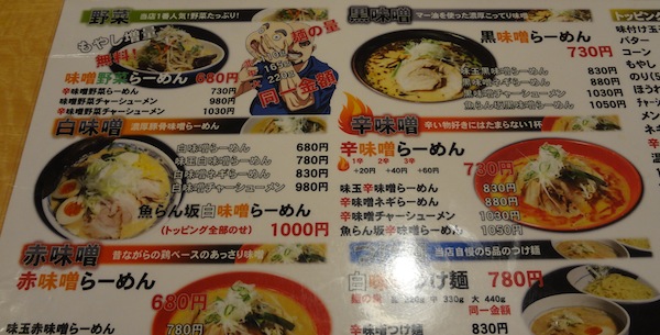 2011年2月に開店したお店。昔はよってこやがあった場所だ。メニューは、至極の味噌らーめん(特製の白味噌に濃厚豚骨スープ)730、情熱の味噌らーめん(秘伝の3年熟成赤味噌に清湯スープ)730、辛味噌らーめん800、味噌野菜らーめん780、魚らん坂味噌980、塩野菜らーめん760、醤油らーめん650、塩らーめん650、味噌つけ麺780、魚醤つけ麺780、辛味噌つけ麺830、餃子350など。基本は味噌らーめんである。カウンターに案内され、白味噌らーめんを注文する。