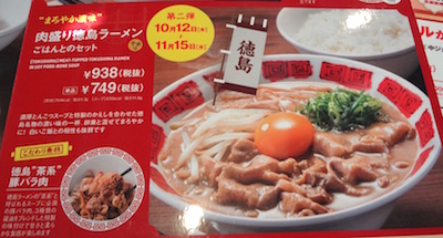 バーミヤンでの「ラーメン祭り」。何にしようかと考えたが、期間限定でこの時期しか食べられない徳島ラーメンにした。バラ肉など再現性がかなり高いと思うし、美味しいのだが、コスパがちょっと。(2017/11)