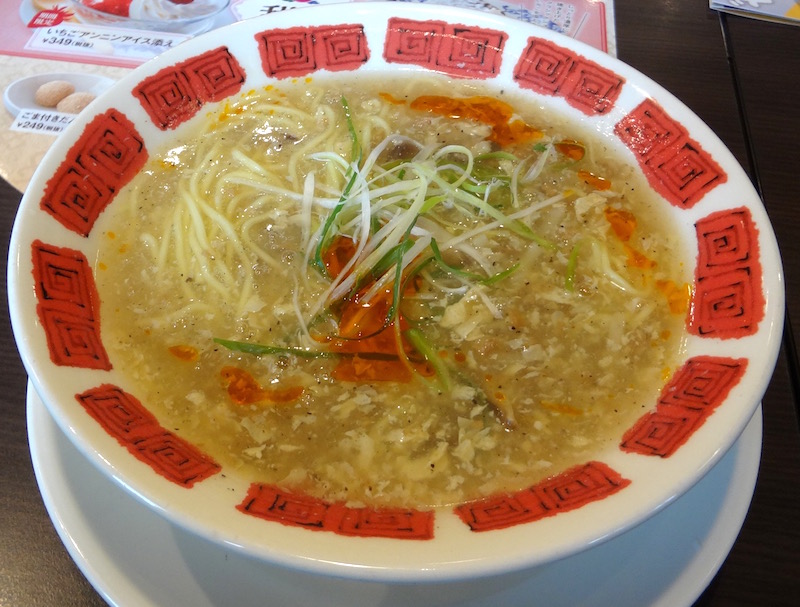仕事の合間の昼食時に利用した。店内は家族連れからカップルまでかなりのお客さんがいる。テーブルにはキャンペーン期間なのか読売新聞が置かれている。酸辣湯麺を注文。しばらくして出てきたものは、酸味と辛味が遠慮がちな、押さえた酸辣湯麺だった。もっとワイルドな味付けでもよかったなあ。(2012/12)