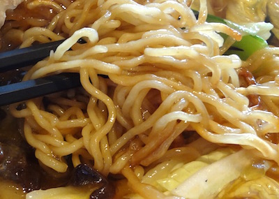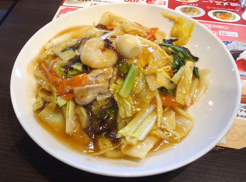 この日は五目焼きそばを注文。揚げ麺にとろみのかかった餡がよく合う。(2018/3)