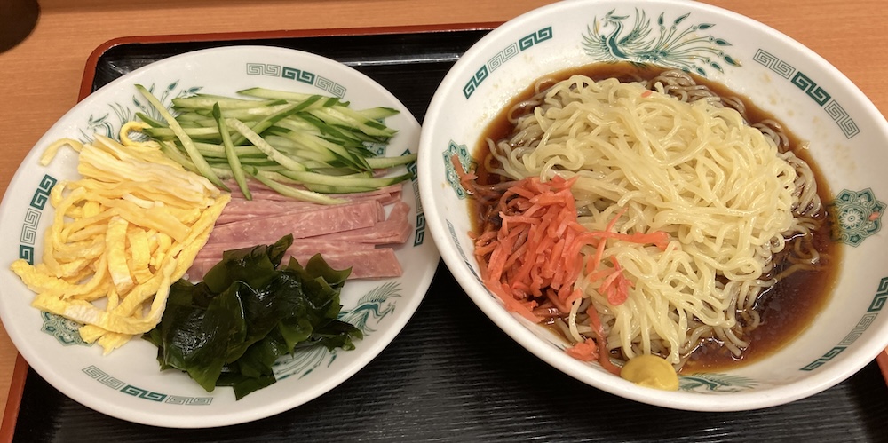 タッチパネルでの注文にも少し慣れてきた。猛暑が続いているので、冷やし中華を注文。麺と具が別盛りで出てきた。メニュー写真を見ると、冷麺は麺の上に具が直接乗っているので、それと区別をするためかも知れない。酸味の強めのタレに紅生姜とカラシがアクセント。これが630円で食べられるなら満足だ。(2024/8)