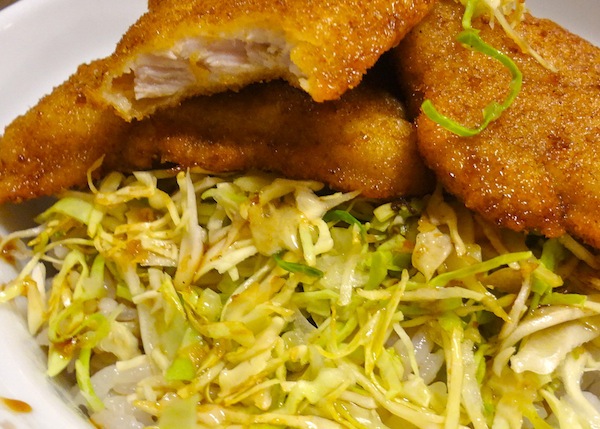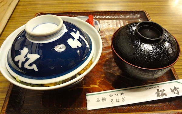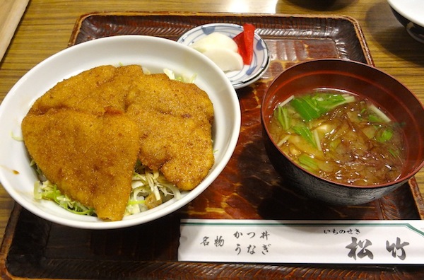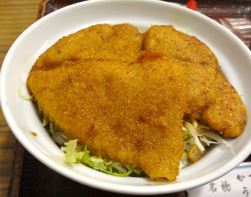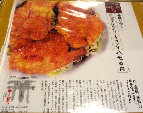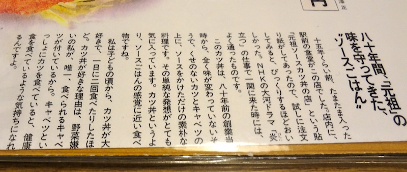 入口脇の幟に「元祖ソーツカツ丼」と書いてある。店内に入ると、ホール係の女性の元気で活気のある声が響いている。テーブル席へ案内されメニューをみるが、注文はもちろん「ソースカツ丼」。メニューには「お急ぎのお客様は、ソースカツ丼をお勧めします」という主旨のコメントが書かれている。駅前食堂らしい心配りだ。店内には食事をする人、お酒とつまみで気持ちよくなっている人などでにぎわっている。その中をホール係の女性がまさに飛び回っている。それにしても元気のいい女性だ。夕食時なのでちょうど忙しい時間帯なのだろう。やっと私の注文したソースカツ丼が出てきた。ごはんの上にキャベツの千切りがほどよくのり、その上にカラッと揚げられたカツが3枚ある。肉自体の旨味もあるし、厚さもちょうどよいし、ソースの味も私の好みである。キャベツもよいアクセントとなっている。(2014/11)