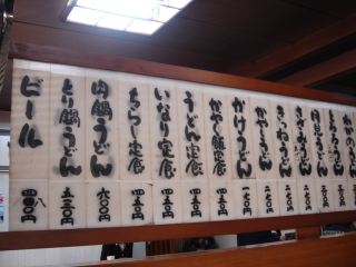 路地裏にある老舗風のお店。平日のお昼時なので常連らしき人で賑わっている。このお店はセルフではなく普通に注文するスタイル。メニューは、ぶっかけ300、かけ170、かやく270、きつね270、きざみ270、月見300、とろろ300、わかめ300、うどん定食450、いなり定食450、ちらし定食450、肉鍋うどん600、とり鍋うどん530など。