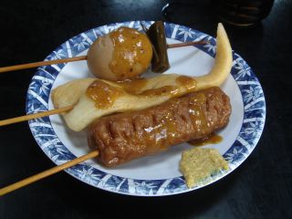 テーブルに座り、ぶっかけを注文すると、「温かいのと冷たいのがありますが?」と聞かれたので「温かい」方を注文。おでんも注文しようとすると「おでんはご自分でとってきてください」とのこと。そこでおでんコーナーに行き、お皿に玉子・白いさつま揚げのようなもの・ごぼう巻き(写真上から)の三点をとってきた。この白いものは「白天ぷら」というようだが確証はない。愛媛ではじゃこ入りのさつま揚げ(つけ揚げ)のことを「じゃこ天」というから、四国・九州ではこのようなものを「天ぷら」や「天」と称するかも知れない。おでんの串は長く、この本数で計算されるようである。
