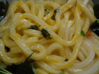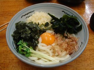 たちまちにたまごぶっかけが出来てきた。テーブルにある薬味をいろいろと入れてかき混ぜて、玉子が絡まったところをいただく。なめからで美味である。グルテンが豊富な強力粉の小麦粉を使ったうどんが美味しいからいろいろな食べ方を楽しむことができるんだなぁ。(2008/2/15)