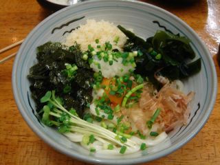 「汁が少なめで生玉子を絡めて食べたいのですが・・・」と尋ねると、「たまごぶっかけですね。普通でいいですか?」と親切に教えてくれた。そこで「たまごぶっかけ、温かいのを普通で」と注文する。ここでメニューをじっくりとみる。かけ200、月見290、きつね300、かやく300、わかめ300、天ぷら560、山かけ530、きざみ350、野菜かき揚げ380、カレー450、かしわ(鶏肉)530、あんかけ(鶏肉)570、肉(タップリ)590、鍋焼き700、肉・天ぷら950、生じょうゆ300、ぶっかけ300、たまごぶっかけ330、温泉卵ぶっかけ370、山いもぶっかけ500などなど、多彩。出来るまでおでんを食べることにする。やはりおでんは自分で取るのが高松流らしい。今回はこんにゃく・牛すじを選んだ。