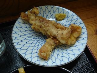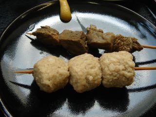 まずは温玉ぶっかけ(小)をカウンターの一番左側で注文し、それをトレイに乗せてから右側に動く。天ぷらがあるので、げそ天を一つ取り、そしておでんコーナーで牛スジとつくねを取る。最後に支払いを済ませてから席に着くというカフェテリア方式である。670円がとても安く感じられるほど満足である。(2008/2/16)