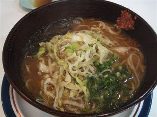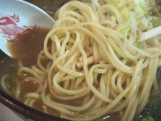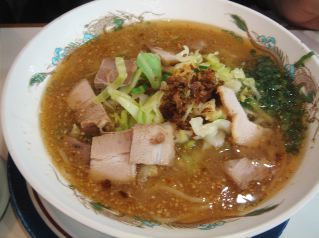 テーブルに「当店のお勧め 味噌ラーメン コクのあるラーメンです 唐辛子がベースの辛子味噌を混ぜるとコクが増す」と書いてある。まずはスープをそのまま飲んでみる。札幌味噌ラーメンのようなパンチはしないが、まろやかな味噌豚骨スープである。丼の端に辛子味噌があるので、それを少しずつ溶かしてみると、ピリリとしてコクがさらに出て来る。麺は中太ストレート麺で柔らかい。具は、野菜挽肉炒め(キャベツ多し)・キクラゲ。(2009/1/30)