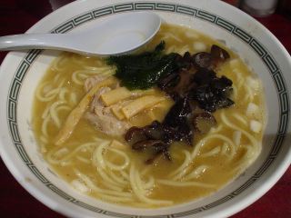 水はセルフサービスだ。醤油ラーメン登場。スープは、とろみがある濃い豚骨スープ。ショウガの風味が強いのか、口の中でピリッとくる。雑味も多くワイルドなスープである。麺は、家系風の太くてしっかりした麺。具は、チャーシュー・キクラゲ・メンマ・ワカメ・玉ネギ微塵切り。チャーシューは箸で持とうとするとくずれそうな柔らかいもの。キクラゲは大きな形のまま、かなり大量に入っている。玉ネギの微塵切りもこってりしたスープにマッチしている。まさしくイレブン系である。(2005.2.5)