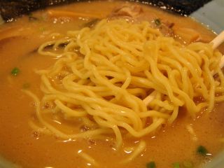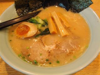 出てきたのは一見して家系ラーメン。県内は家系が多いなぁ。スープは確かに油が少なめでギトギトしていない、ややあっさりとした家系豚骨スープ。麺は中太縮れ麺。具は、チャーシュー(パサパサ)・のり(3)・味玉子(1/2)・ほうれん草・メンマ(太柔)・ネギ。(2007/11/9)