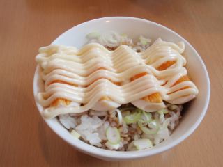 今日はそのカリー麺を我慢しての豆乳辛口味噌ラーメンである。出てきた味噌ラーメンは白味噌の豆乳スープに、表面にラー油が浮かんでいる。辛口といってもそんなに刺激も強くなく辛い物苦手な方でも問題ない辛さである。麺は中太縮れ麺、トッピングにチャーシュー・もやしと味玉・メンマがのっている。バランスのとれた味噌ラーメンだと思う。ミニ玉マヨ丼はランチタイムだと200円(通常300円)だとの事でオーダー! ごはんにチャーシューのタレが絡めてうまい。