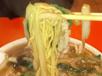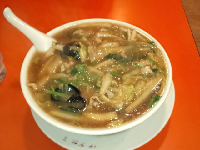 醤油ラーメンに熱々の豚肉と野菜の餡がたっぷりのっている。スープをすすると、鶏ガラに野菜のうまみがたっぷりで青春を思い出す!美味しい。餡のこってりさと、さっぱりしたスープのコントラストが絶妙。ただ、この熱々の餡がふたをするので餡と麺をバランスよく食べないと麺がのびてしまう。野菜のボリュームたっぷりでお腹一杯! ごちそうさまでした。他の常連とおぼしき客が「今日もうまかったよ〜」と店主に声かけしていた。これからも茅ヶ崎にずっと残っていてほしい。(2011/2/17)
